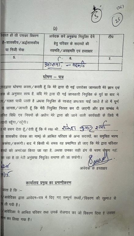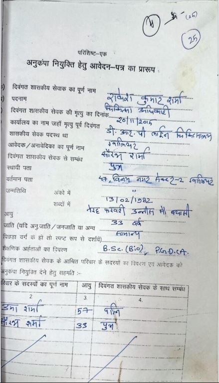 सौरभ शर्मा ने दिसंबर 2015 में खुद अपने हाथों से निर्धारित फॉर्मेट में अनुकंपा नियुक्ति के लिए आवेदन पत्र भरा था और उस पर हस्ताक्षर किए थे। इसके साथ अनुकंपा नियुक्ति फॉर्म की कॉपी भी संलग्न है। इसमें उसने अपने पिता का पूरा नाम राकेश कुमार शर्मा लिखा है। पिता की मृत्यु की तारीख नवंबर 2015 लिखी है। शैक्षणिक योग्यता के विवरण में बीएससी पीजीडीसीए लिखा है। परिवार के सदस्यों में मां उर्मा शर्मा और खुद की जानकारी लिखी है। बड़े भाई सचिन शर्मा, जिनकी जानकारी छिपाई गई, सितंबर 2013 में शासकीय सेवा में आए थे और रायपुर वित्त विभाग कार्यालय में सहायक संचालक के पद पर ऑडिट सेल में कार्यरत हैं।