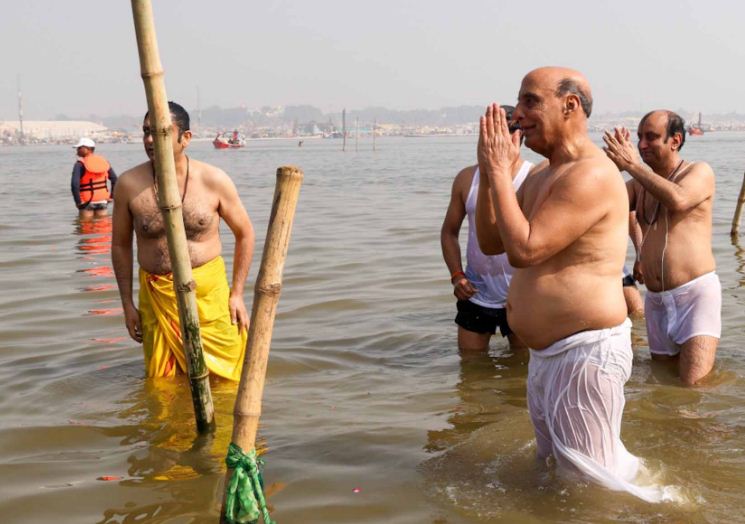 रक्षा मंत्री राजनाथ सिंह ने त्रिवेणी संगम में डुबकी लगा कमाया पुण्य